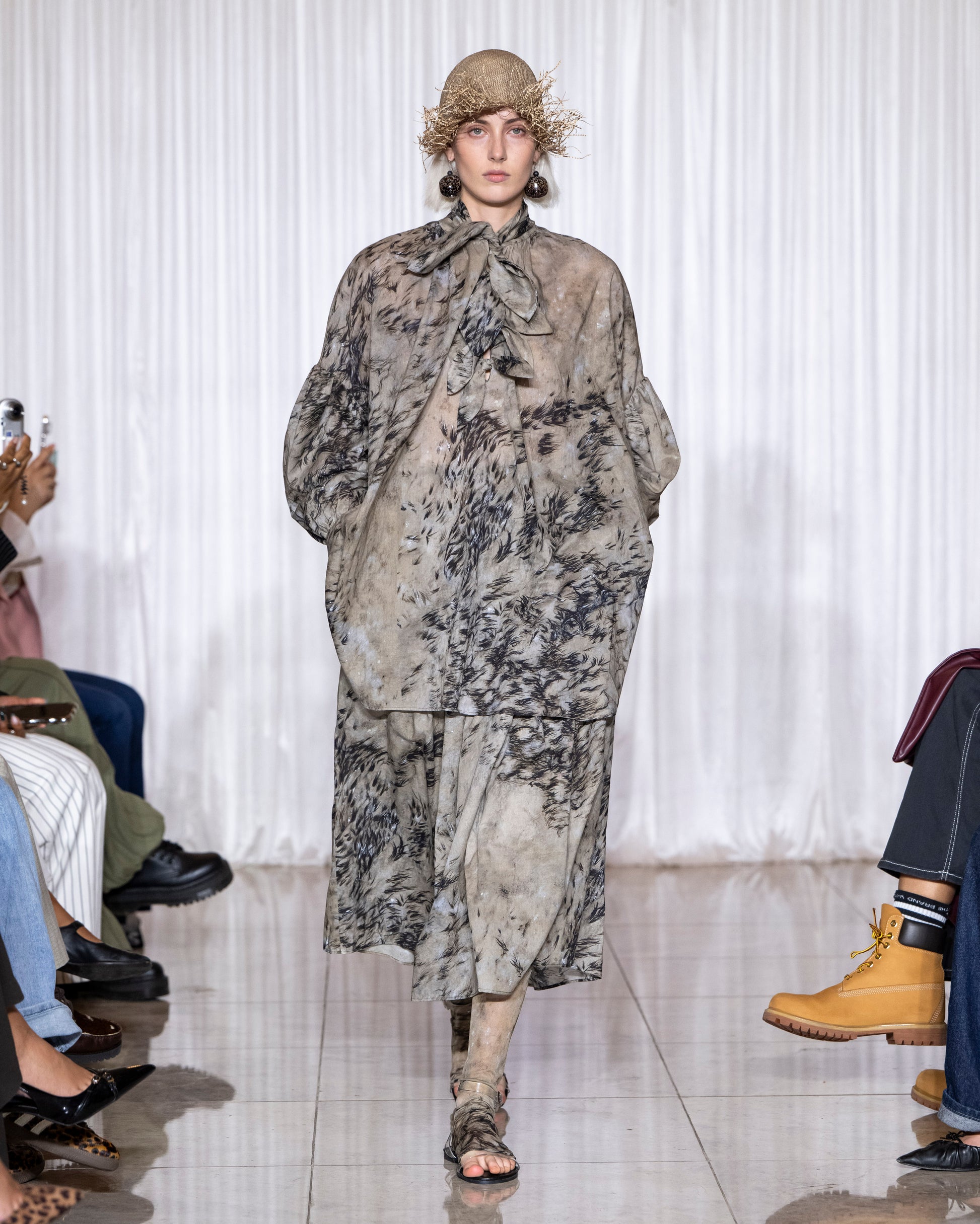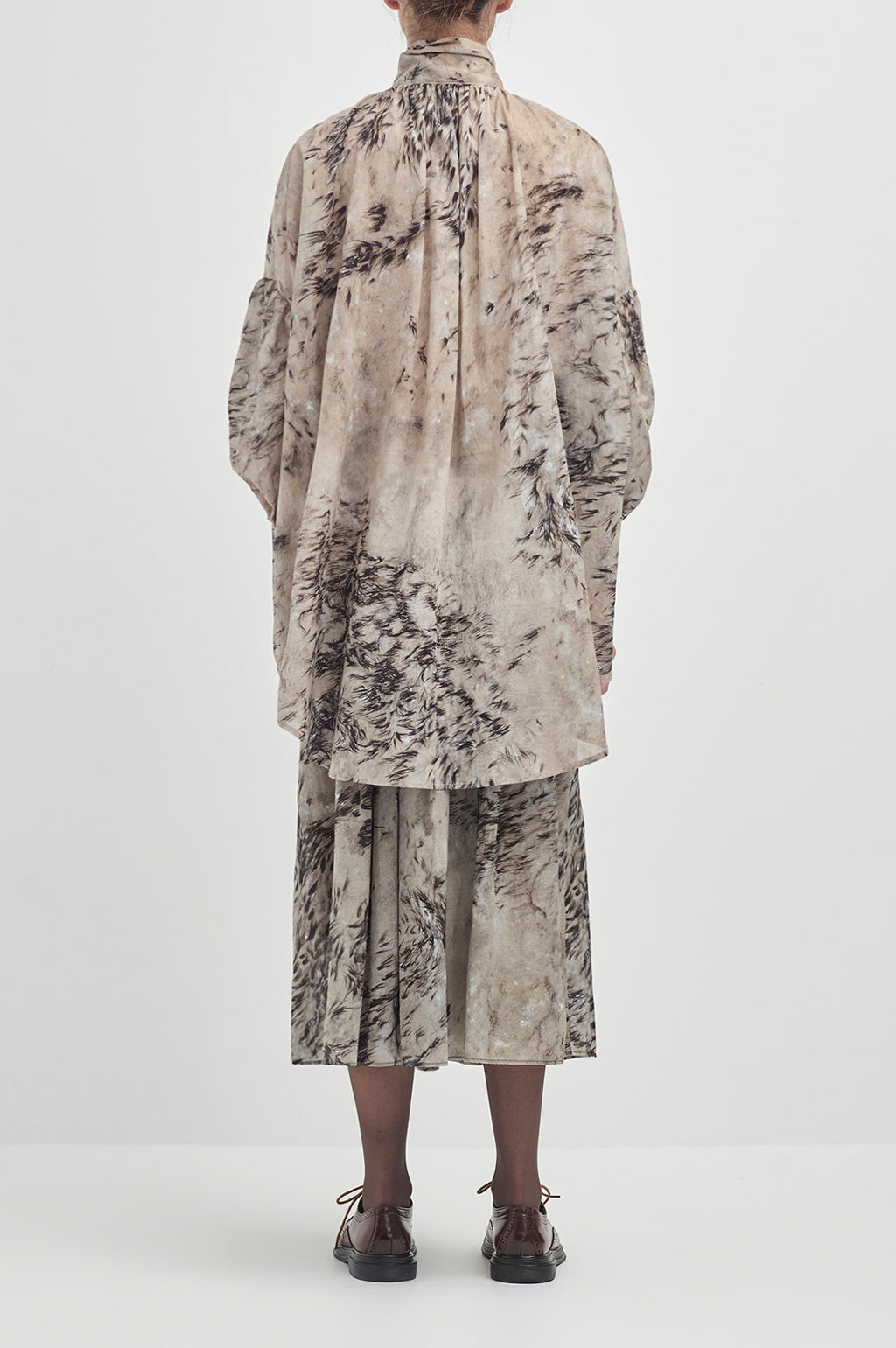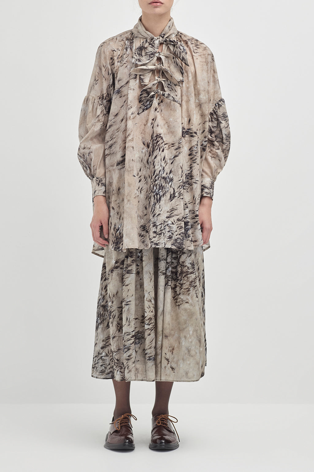 Multiple ties in descending size, on a billowing gathered shirt.