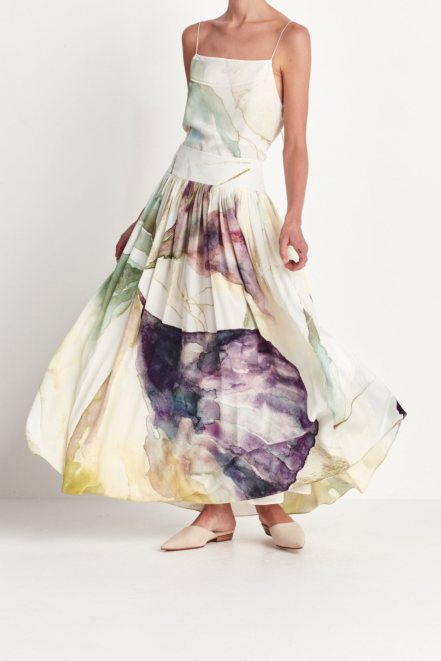 Voluminous skirt gathers onto a straight band, reminiscent of a shirt cuff with shell buttons. Hidden side pockets, length skims above the ankles.